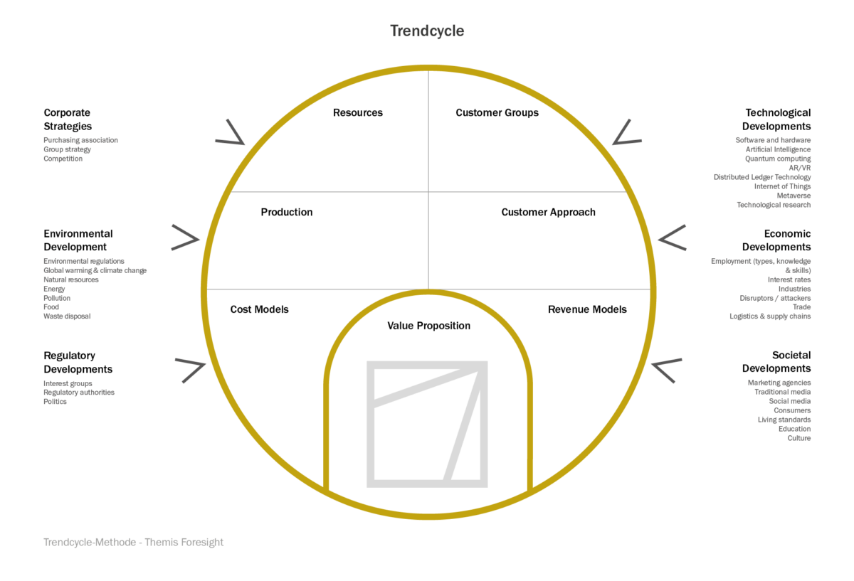 The Trendcycle examines social, technological, economic, environmental and political influences and how they affect the business model or an industry. It combines the STEEP analysis with the Business Model Canvas.