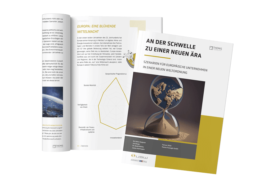 Wie sich diese Szenarien auf die Geschäftsfelder Ihres Unternehmens auswirken werden, lässt sich antizipieren. Themis Foresight erarbeitet heute schon für Konzerne und Unternehmensverbände unterschiedlicher Branchen Folgenanalysen der Entwicklungslinien, die unseren Szenarien zugrunde liegen.