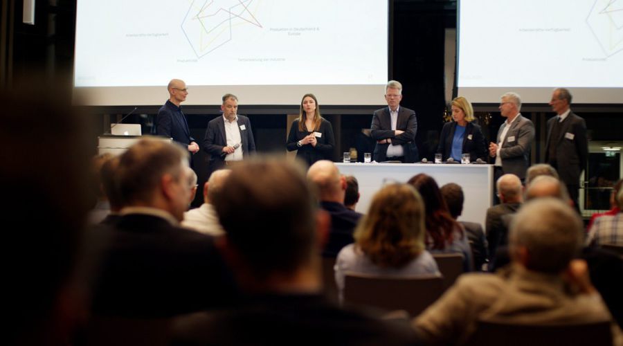 In einer abschließenden Podiumsdiskussion diskutierten Barbara Resch (IG Metall Baden-Württemberg), Dr. Joachim Schulz (Südwestmetall), Hanno Hoehn (MANN+HUMMEL Group), Prof. Dr. Hubertus Bardt (Institut der deutschen Wirtschaft) und Carina Stöttner (Themis Foresight) die Konsequenzen der Szenarien für Industrieunternehmen, Beschäftigte und Politik. Die Diskussion wurde moderiert von Jan David Ott (Themis Foresight).